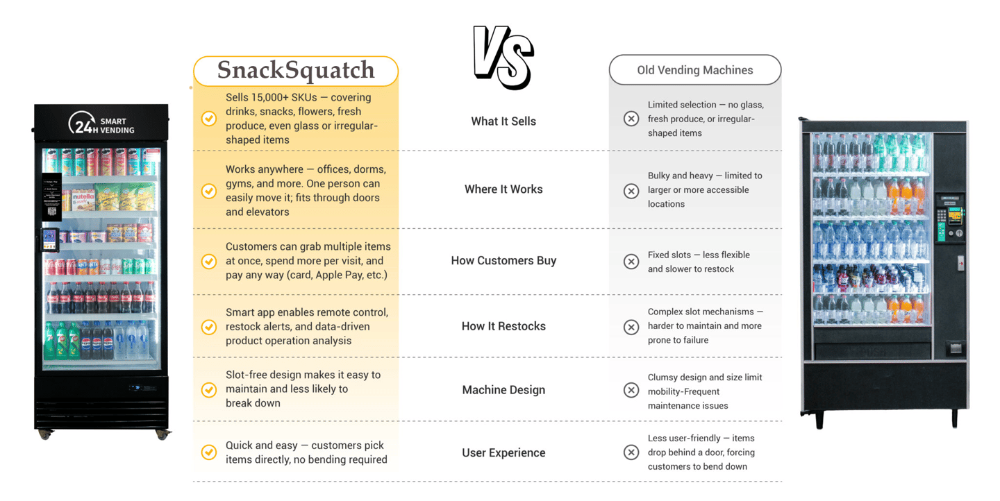 Description: The Squatch Pantry offers open access and smart shelf tracking for dry goods, snacks, and shelf-stable meals. Ideal for offices and retail locations seeking frictionless service.
